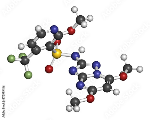 Pyroxsulam herbicide molecule. 3D rendering. Atoms are represented as spheres with conventional color coding: hydrogen (white), carbon (grey), nitrogen (blue), oxygen (red), sulfur (yellow), etc