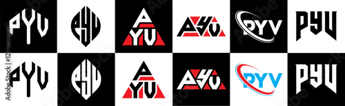 PYV letter logo design in six style. PYV polygon, circle, triangle, hexagon, flat and simple style with black and white color variation letter logo set in one artboard. PYV minimalist and classic logo