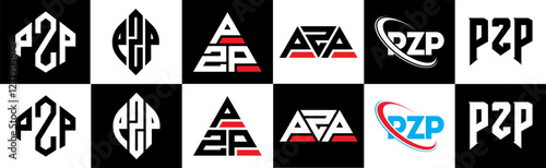 PZP letter logo design in six style. PZP polygon, circle, triangle, hexagon, flat and simple style with black and white color variation letter logo set in one artboard. PZP minimalist and classic logo