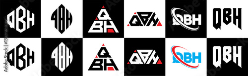 QBH letter logo design in six style. QBH polygon, circle, triangle, hexagon, flat and simple style with black and white color variation letter logo set in one artboard. QBH minimalist and classic logo