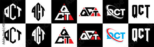 QCT letter logo design in six style. QCT polygon, circle, triangle, hexagon, flat and simple style with black and white color variation letter logo set in one artboard. QCT minimalist and classic logo