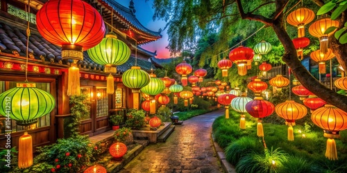 Qingming Festival Night: Low Light Lantern Photography, Vibrant Colors, Chinese Tradition, Serene Nature, Festive Atmosphere