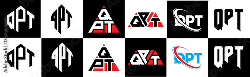 QPT letter logo design in six style. QPT polygon, circle, triangle, hexagon, flat and simple style with black and white color variation letter logo set in one artboard. QPT minimalist and classic logo