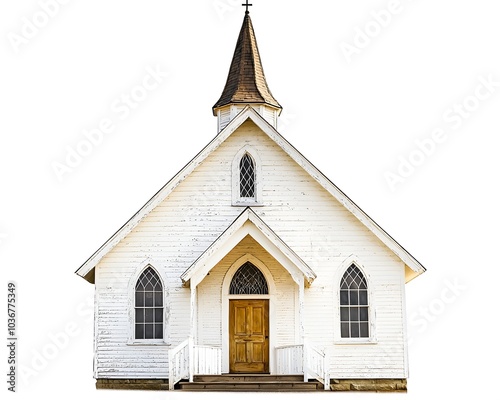 Quaint Country Chapel with Steeple and Arched Windows on White Background