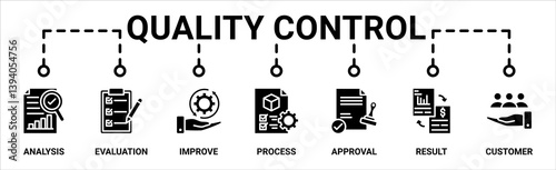 Quality control web banner icon vector illustration concept for product and service quality inspection with analysis, evaluation, improve, process, approval, result, and customer icon.