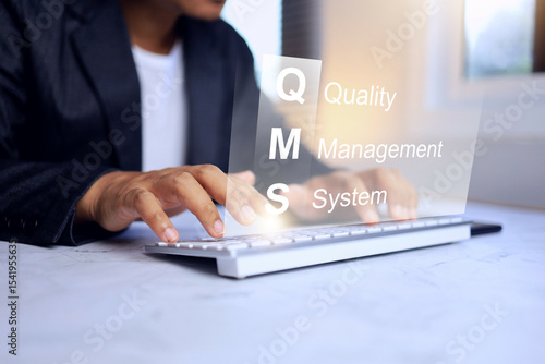Quality management system concept with businessman working on desktop with computer to manage the quality process follow to iso 9001