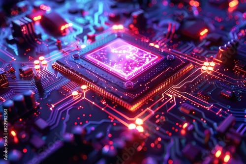 Quantum computer core, glowing qubits, futuristic design, neon blue and purple, hightech lab, vibrant colors, high resolution