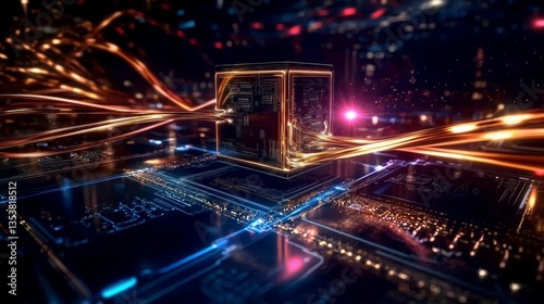 quantum computing entanglement concept. Multi-layered AI processor with embedded quantum features.