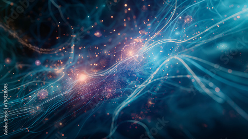Quantum entanglement depicted with particles connected by chaotic, abstract lines, visualizing the spooky action at a distance, Particle, Research, with copy space