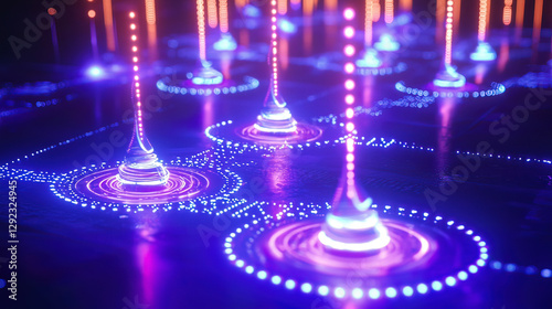 Quantum routers glowing with light particles, transferring quantum data securely across global nodes