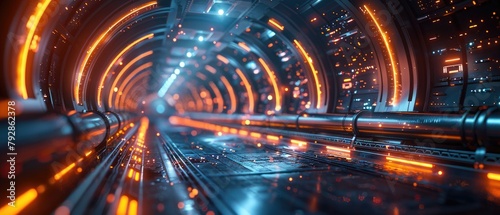 Quantum teleportation station in a high-tech facility, with portals actively sending and receiving passengers