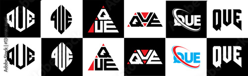 QUE letter logo design in six style. QUE polygon, circle, triangle, hexagon, flat and simple style with black and white color variation letter logo set in one artboard. QUE minimalist and classic logo