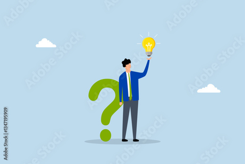 Question and answer, clever entrepreneur with a question mark symbol and lightbulb idea.