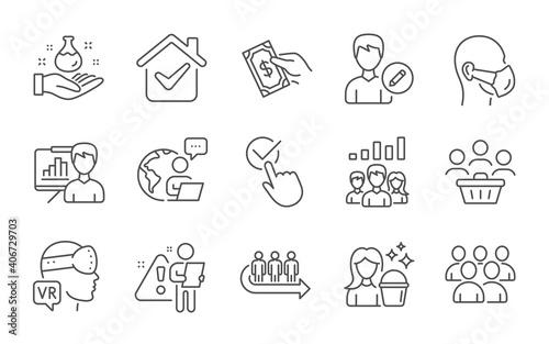 Queue, Group and Buyers line icons set. Presentation board, Augmented reality and Teamwork results signs. Pay money, Cleaning and Checkbox symbols. Line icons set. Vector