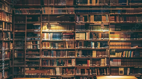 Quiet and serene library with endless shelves filled with books in warm, soft lighting, perfect for studying or reading.