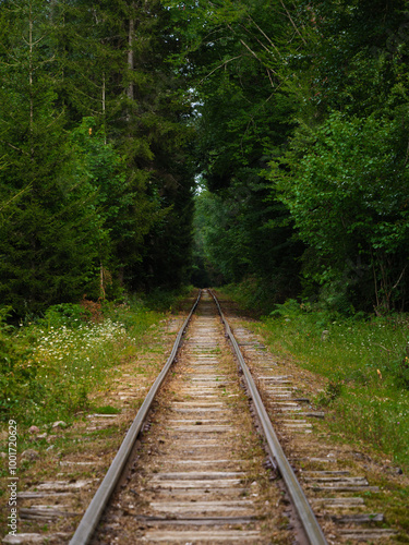 Quiet railway tracks tretch into the distance through lush green forest on a serene day.