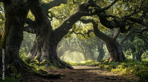 quiet, secluded forest with a canopy of ancient trees and a peaceful, still atmosphere.