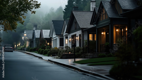 Quiet suburban street with row of cozy houses illuminated in the evening, surrounded by trees and soft fog, with a parked car and lush landscaping.