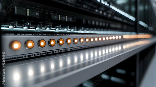 Rack-mounted servers with illuminated indicators in a data center.