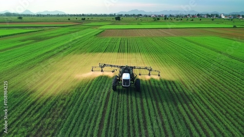 ractor spray fertilizer on green field drone high angle view, agriculture background concept.