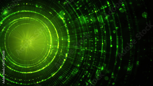 Radial green glowing rays with bokeh circles on dark gradient background for big data visualization and green tech wallpaper