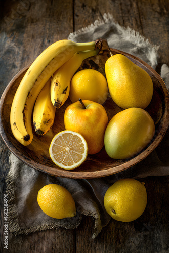 Radiant Array of Yellow Fruits: A Still Life Showcasing Bananas, Lemons, Mangoes, and Apples on Rustic Wood
