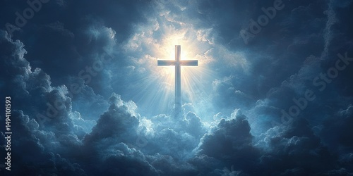 Radiant cross shines brightly through dramatic dark clouds with light rays piercing the sky, evoking a sense of hope and spirituality