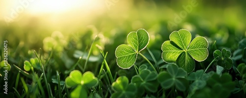 Radiant Four Leaf Clover Patch Illuminated by Sunlight Bursting Through a Lush Green Meadow Landscape Scene