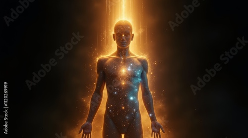 Radiant golden human figure illuminated by cosmic energy and stars in a mystical conceptual art illustration