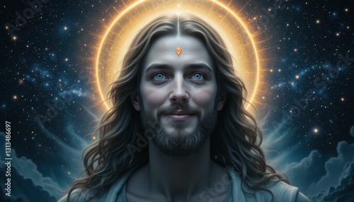 Radiant Man with Halo and Cosmic Background Illustrating Serenity