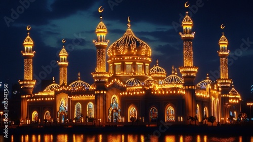 Radiant Mosque Shines with Golden Lights at Night, casting a warm glow on calm waters