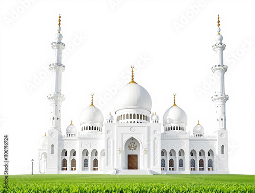 Radiant Serenity A Pristine White Islamic Mosque Amidst Lush Greenery