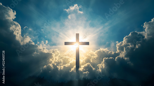 Radiant Sunlight Shining Behind Cross Against Majestic Cloudy Sky Spiritual Symbolism : Generative AI