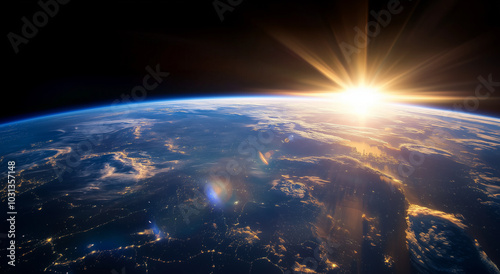 Radiant Sunrise Over Earth from Space with Sparkling City Lights