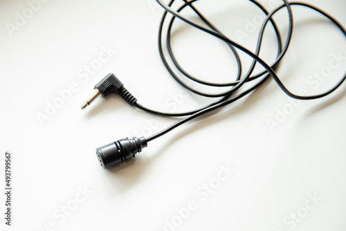 Radio microphone buttonhole on a light background. Equipment for reporting and videography.
