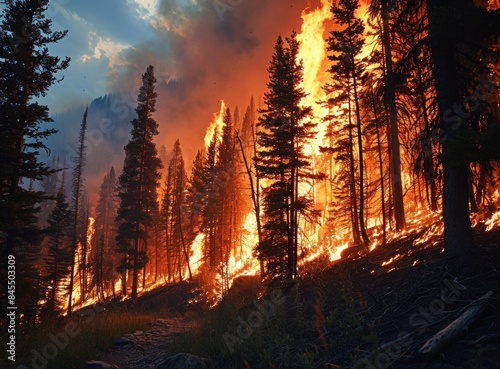 Raging wildfire engulfing a dense forest, with flames leaping from the trees and smoke billowing into the sky.