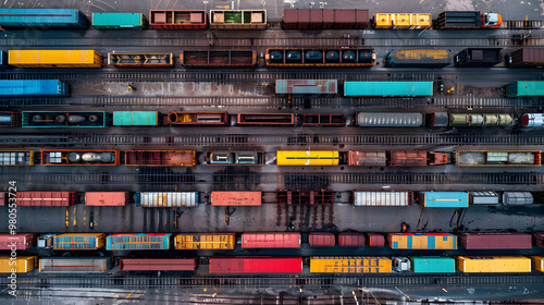 Railway freight station or junction, trains and wagons, top view. AI Generated