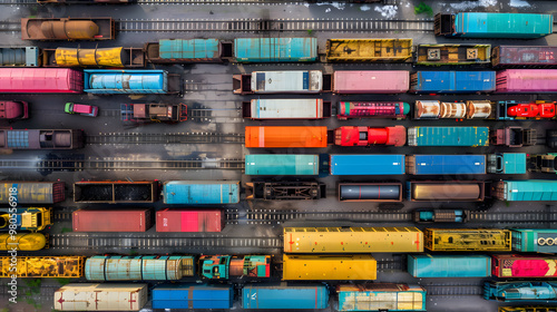 Railway freight station or junction, trains and wagons, top view. AI Generated