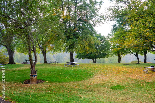 Rain showers fall in a canyon behind a park at the Cataldo State Mission in the Coeur d'Alene area of North Idaho, USA.