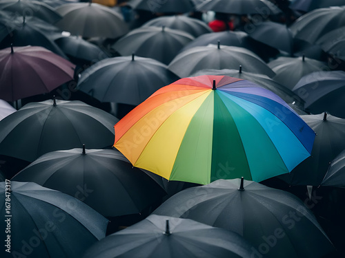 Rainbow Colored Umbrella Standing Out Among Black Umbrellas – Concept of Uniqueness, Diversity, and Being Different
