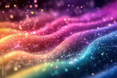 Rainbow glitter waves with sparkling bokeh lights, a vibrant and colorful abstract background.