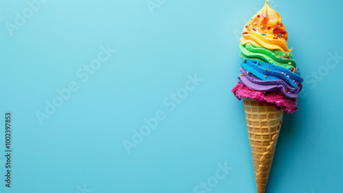 Rainbow ice cream in a cone on a blue background. Colorful and sweet dessert. Ai generative