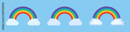 Rainbow icons with fluffy clouds on blue background, representing weather, hope, diversity, nature, positivity, LGBTQ+ symbolism, and cheerful visual elements for design or decoration