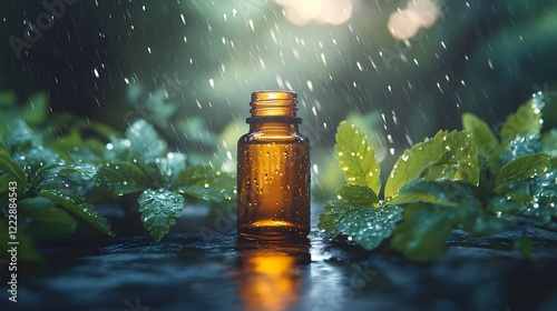Rain-drenched amber glass essential oil bottle sits on dark stone surface amid lush green leaves, creating moody atmosphere with dramatic lighting and misty background elements.