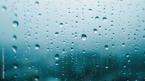 Raindrop Symphony, a close-up of droplets clinging to a window, creating a misty veil that softens the outside world, evoking a serene and contemplative atmosphere.
