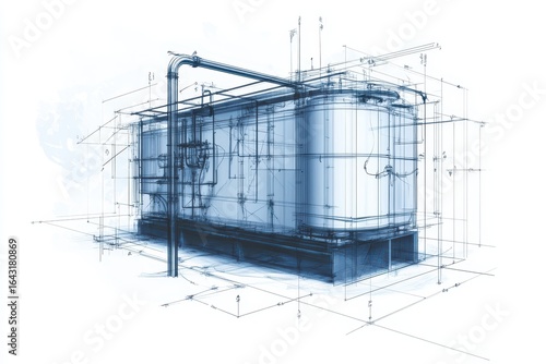 Rainwater harvesting tank – Blueprint-style 3D visual of tank with overflow system and sediment filtration on white background.