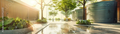 Rainwater harvesting tanks in a community center, sustainable water management, front view, emphasizing ecoconscious living, digital binary as object, colored pastel