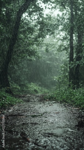 Rainy day walk through lush forest nature scene ground-level view serene environment tranquility and reflection