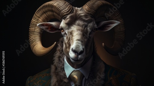 Ram or sheep animal, Close up of head and horns of a wild big horned, isolated black white. Generative ai