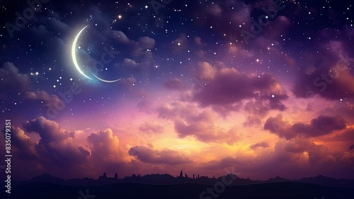 Ramadan dusk picture. Beautiful religious background with crescent, stars and glowing clouds, copy space, generative ai